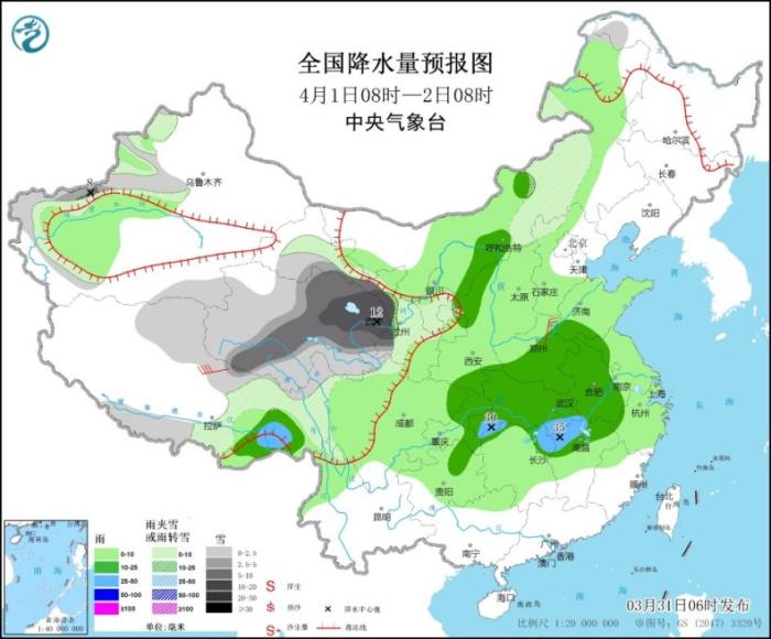 3月31日08时至4月1日08时,新疆北疆西部和南疆南部、西藏北部、西北地区中部、甘肃南部等地部分地区有小到中雪或雨夹雪,局地有大到暴雪(10~11毫米)。内蒙古中西部、西藏东南部、西北地区东南部、江淮大部、江汉东部、江南北部和西部、西南地区东北部等地部分地区有中到大雨,其中,江西北部、浙江西南部等地部分地区局地有暴雨(50~65毫米)。内蒙古西北部、西藏中部、浙江北部等地部分地区有4~6级风。