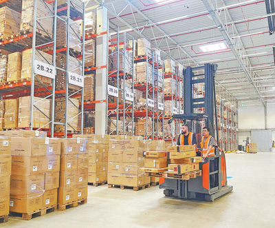 德国北莱茵—威斯特法伦州莫尔斯市的一处海外仓内,工人操作电动叉车搬运货物。