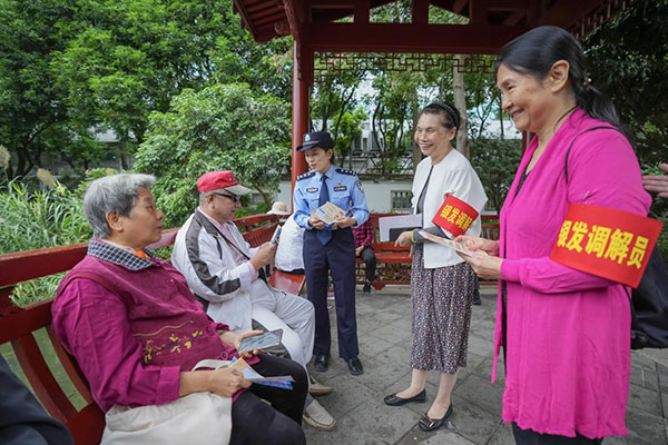 10月28日,位于福州市鼓楼区安泰街道黎明湖公园的茶馆驿站,由“福州市公安局鼓楼分局安泰派出所民警+安泰街道综治中心干部+银发普法调解员”组成的宣讲队,正在给群众宣传防范网络诈骗、养老反诈、矛盾纠纷等知识。