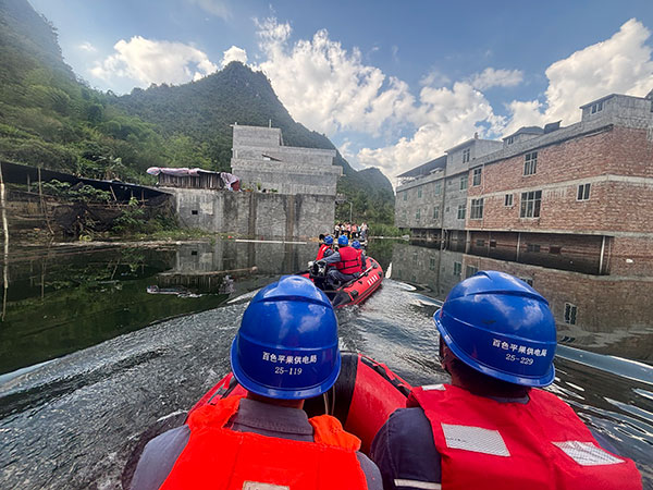 10月18日,在广西百色靖西市新甲乡大甲街内涝现场,来自百色供电局的13名“党员突击队”队员,经过5小时连续奋战,从新建变压器引出400余米临时线路,将电线架至受淹居民楼安全区域。傍晚18时40分,随着开关合闸,一条覆盖大甲街40余户受灾群众的临时线路顺利完工,受灾群众家里恢复了烟火气与生机。