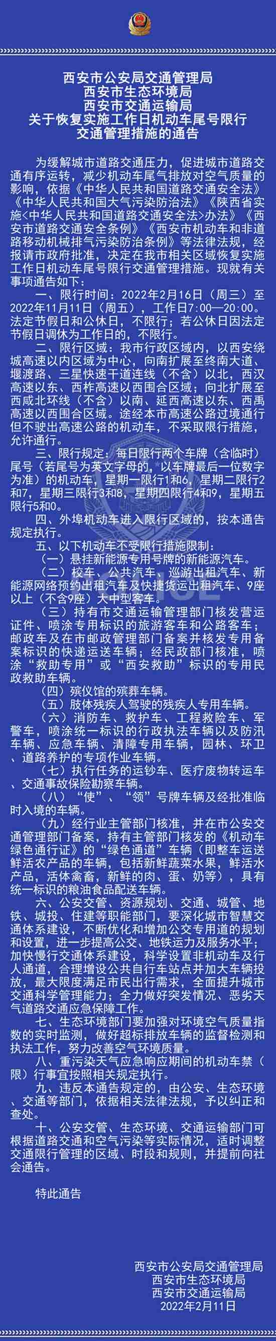近日,西安市疫情防控工作进入常态化,春节假期后全市交通流量稳步回升。为缓解城市道路交通压力,西安市公安局交通管理局、生态环境局、交通运输局发出通告,自2月16日(下周三)起,恢复实施工作日机动车尾号限行交通管理措施。