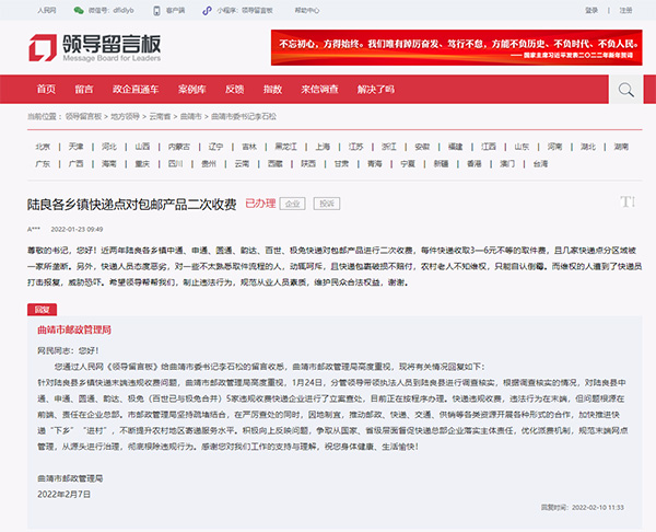 “近两年陆良各乡镇中通、申通、圆通、韵达、百世、极兔快递对包邮产品进行二次收费,每件快递收取3-6元不等的取件费……”近日,有网友通过人民网“领导留言板”向云南省曲靖市委书记留言反映称,曲靖市陆良县各乡镇快递网点对包邮产品二次收费且多家快递被一家垄断。