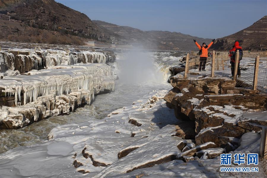 12月23日,游客在山西吉县黄河壶口瀑布景区拍照留念。近日,受持续降温天气影响,黄河壶口瀑布出现“冰瀑玉壶”景观,吸引了众多游客。新华社发(吕桂明 摄)