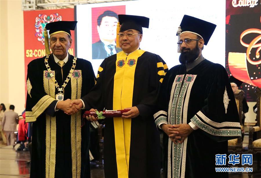 10月6日,在巴基斯坦拉合尔,巴基斯坦内外科医师学会主席扎法尔·乌拉·乔杜里(左)向来自潍坊市人民医院的孙作成(中)颁发最高荣誉学位。 新华社记者刘天摄