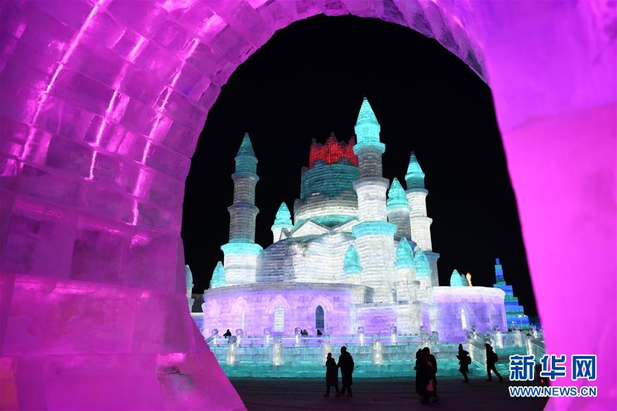 12月23日,游客在哈尔滨冰雪大世界园区游玩。