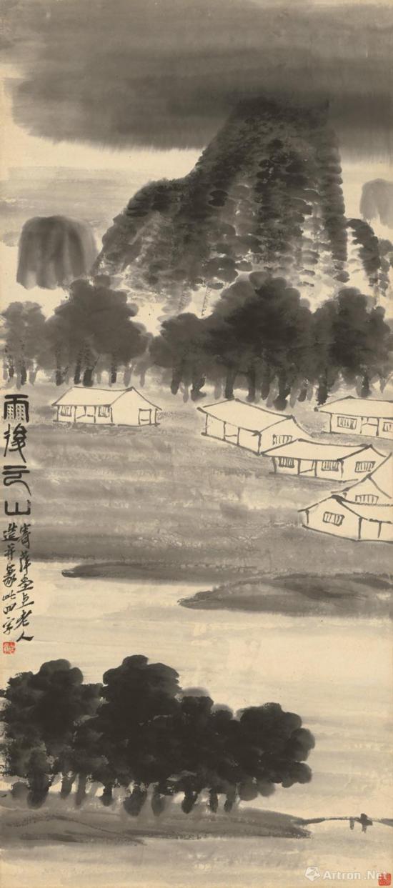 《齐白石四季山水十二条屏-雨后云山》表达了“山雨欲来风满楼”的感觉,用破墨在表达浓淡的变化,每一个局部都有很丰富的墨色的变化,山和树都是很重的墨色,但房屋却是白色的,简单的线条勾画而成,形成对比。