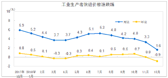 国家统计局今日发布数据显示,2018年12月份,全国工业生产者出厂价格同比上涨0.9%,环比下降1.0%;工业生产者购进价格同比上涨1.6%,环比下降0.9%。全年工业生产者出厂价格比上年上涨3.5%,工业生产者购进价格上涨4.1%。