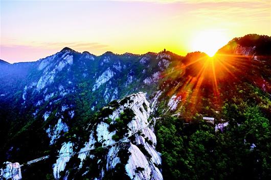 图为:5月11日,黄冈大别山世界地质公园核心景区之一——罗田县天堂寨景区哲人峰迎来第一缕阳光。(湖北日报全媒记者 陈勇 通讯员 刘世民 高学工 摄)
