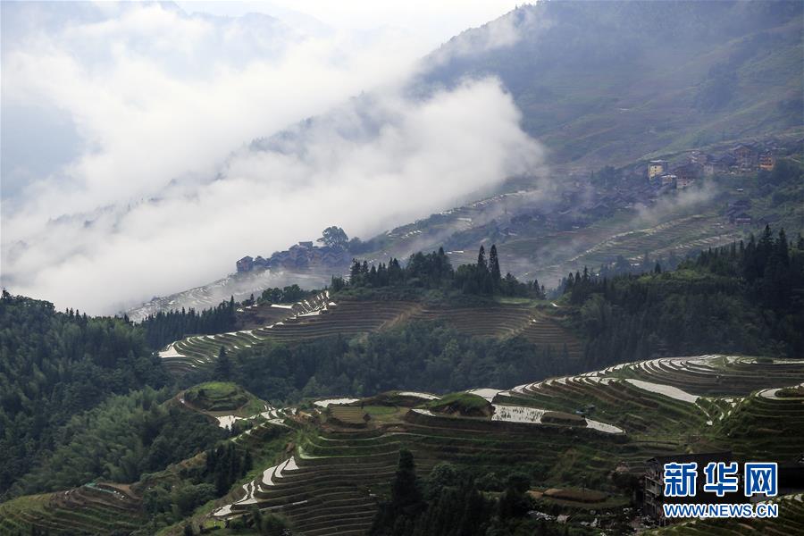 这是5月26日拍摄的广西龙脊梯田雨后景色。 雨后的广西龙胜各族自治县龙脊梯田云雾升腾,村寨、梯田在云海中若隐若现,美如仙境。 新华社发(刘满仓 摄)
