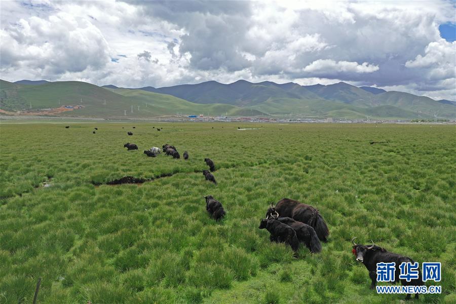 这是西藏当雄县草原上的牦牛(8月9日无人机拍摄)。进入雨季,藏北当雄县境内的牧场水草丰美,牛羊膘肥体壮。藏北地区是西藏重要的畜牧业产区之一,产自藏北地区的酥油、酸奶、牛羊肉等产品销往各地,是当地牧民的主要收入来源。新华社记者 普布扎西 摄