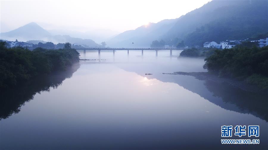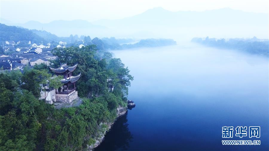8月15日无人机拍摄的桃花潭风景区一景。 当日清晨,位于安徽省宣城市泾县的桃花潭风景区晨雾缭绕,美如画卷。 新华社记者 张端摄