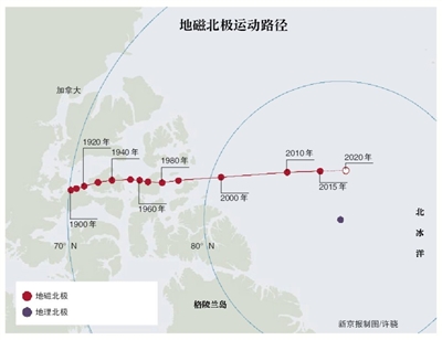 事实上,地磁场包括地磁极和磁力线等一直处于非线性运动变化之中,但是20世纪90年代中期,地磁北极的移动速度突然加快,从之前的每年15公里加速到现在的每年55公里。