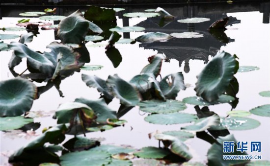 9月18日,大明湖畔的荷花池里映出超然楼的倒影。 新华社记者王凯摄