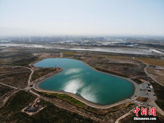5月中旬,航拍镜头下的甘肃张掖戈壁滩上建成的“碧水绿洲”。