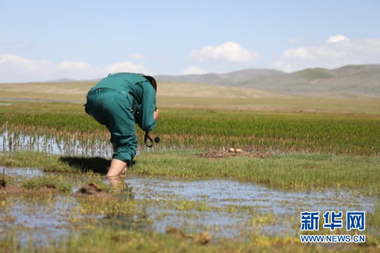三江源国家公园生态管护员卓玛加在湿地对黑颈鹤蛋进行观测(2018年7月15日摄)。新华社记者 田文杰 摄