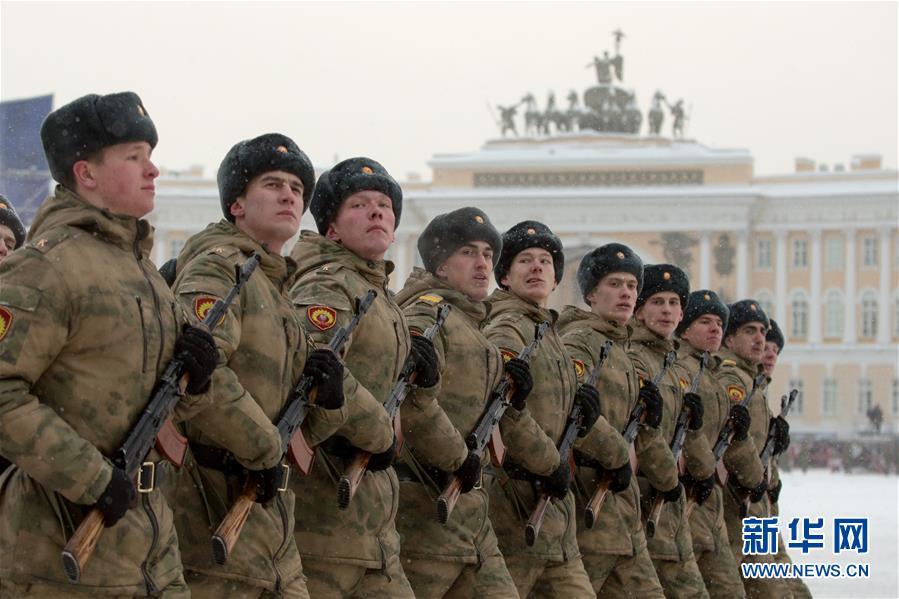1月27日,士兵在俄罗斯圣彼得堡冬宫前广场上参加阅兵。 新华社发(莫京娜摄)