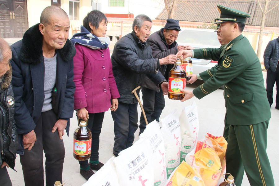 春节前夕,武警陕西总队商洛支队官兵深入商洛市柞水县营盘镇丰河村慰问困难群众,为贫困户送上米面油等慰问品。
