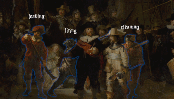 1715年,这幅巨型油画从阿姆斯特丹一个民兵组织总部转移到市政厅。为适应新空间的大小,画布左边被裁掉一大条,其他三边也被裁掉小部分。修复专家和数据分析科学家通过一定的算法和法医成像工具,通过研究画布边缘的变形程度推算被裁剪部分的精确尺寸。