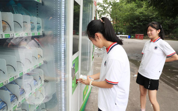 6月22日,在重庆市巴川中学的校园里看见,刚一下课,学生们来到户外活动。在校园里的无人售货机前,两三个学生先在感应消毒机上将手消毒完毕,使用微信扫码支付或者拿出钱投入入钞口,选择好自己需要的饮料。短短十秒钟,一次购物行为便完成,整个过程实现了“无接触式”购物。