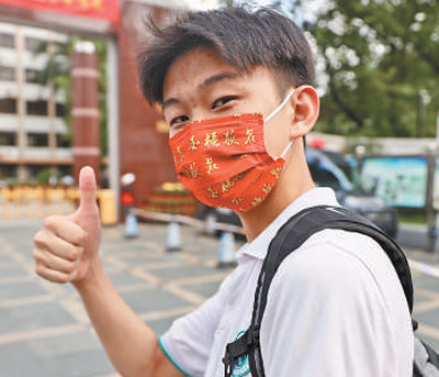 7日,海口市海南中学初中部考点,一名考生与来陪考的小朋友击掌鼓劲。
