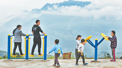 5月11日,重庆市丰都县三建乡夜力坪村6社,村民们一边欣赏风景,一边健身娱乐。