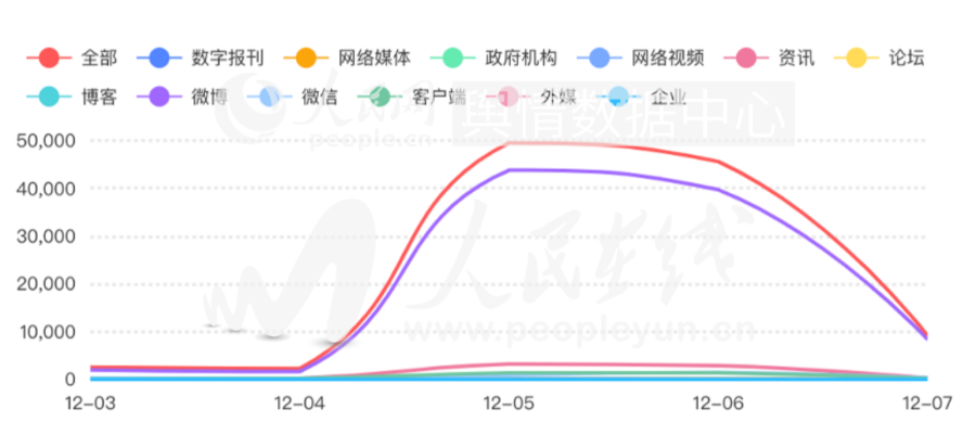 微博成为舆情传播与讨论的重要平台,也成为了“安徽少女跳河溺亡”事件的主要传播渠道之一。据人民众云平台显示,基于微博平台的信息量在传播渠道分布占比近9成。分析相关微博数据可知,截至12月7日上午9时,微博话题#安徽一女孩在警察目视下溺水身亡#阅读量达4260.3万次,#安徽女孩跳河溺亡另一视角曝光#阅读量达1.5亿次,#央视主播评安徽女孩轻生溺亡#达8806万次。