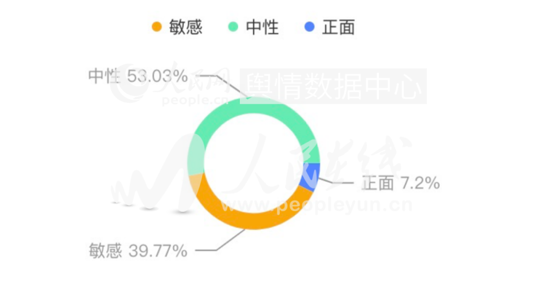 目前,舆论场对“安徽少女跳河溺亡”事件呈现出中性和敏感的情感倾向。据人民众云平台情感分析图统计,在整体舆情信息中,中性情感倾向的信息最多,占比过半,敏感情感倾向的信息次之,占比近4成,正面情感倾向的信息最少,不到1成。