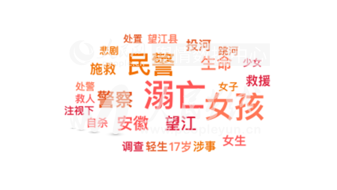 分析“安徽少女跳河溺亡”网络整体信息的热词聚合,目前“民警”“警察”“生命”等成为了舆论场上的重要热词。同时,舆论还聚焦以“注视下”“施救”“救人”等词组为主的警方处置问题。