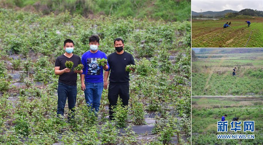 2019年,长期在外闯荡的许祖龙、黄汉钊、韦正舒回到家乡,通过申请青年创业贷款,成立合作社,种植100多亩五加皮、甘蔗、水果等。 拼版照片:左图为在鹿寨县鹿寨镇大村村,许祖龙、黄汉钊、韦正舒(从左至右)在五加皮种植基地里;右图为三人在种植基地劳作的场景(3月9日摄)。 新华社记者 黄孝邦 摄