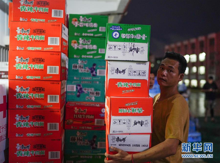 7月9日,工作人员在搬运供安置点村民食用的方便面。 当日,江西鄱阳县鄱阳镇因洪水受灾的村民被转移到多个集中安置点。在鄱阳县五一中心学校安置点,志愿者和工作人员接到任务后不到十小时内,为被转移村民布置了28间教室,供519人安顿,并为村民发放褥子、床单、枕头、盒饭、饮用水等物资。 新华社记者 周密 摄