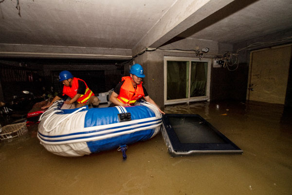 沙包,掷下,吞没,捞起,如此循环反复,十个、一百个、两百个……冲毁,又重新筑起。这是九龙湖梵顿公馆地下车库电信机房的抢修现场。
