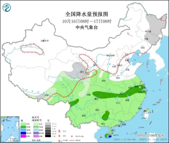 10月16日08时至17日08时,黑龙江中东部、吉林中东部、西藏南部、青海南部和东部、甘肃中部和南部、川西高原东部等地部分地区有小雪或雨夹雪。江淮南部、江南北部、四川盆地东部、云南西北部、广西北部、海南岛大部等地部分地区有中到大雨,其中,海南岛东南部局地有暴雨(50~65毫米)。西北地区东部、华北、东北地区、黄淮、江汉、江淮、江南、华南等地部分地区有4~6级风。中东部海区大部等地部分地区有7~8级风、阵风9~10级。