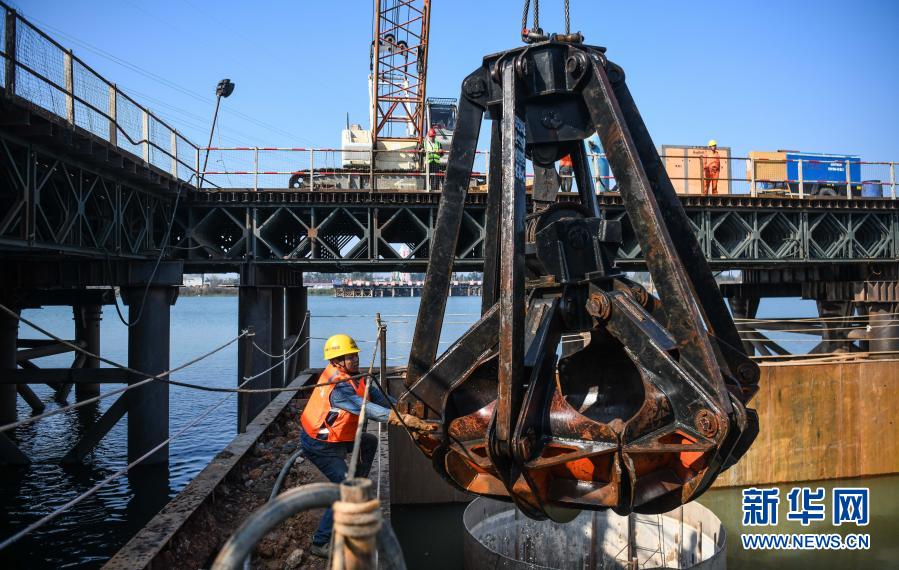 2月12日,一名工人在南玉高铁六景郁江特大桥施工现场作业。新华社记者 张爱林 摄