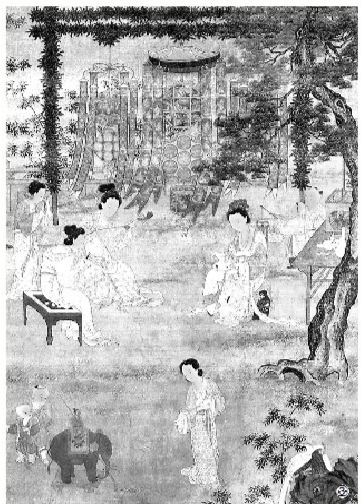 李嵩是供职于宫廷画院的画家,画人物、画建筑、画山水、画花鸟样样在行,可谓全才。这幅《观灯图》居于画面中央的是四位穿着典雅的仕女,左边三位正在弹奏乐器,站立者正奏檀板,两位坐着的仕女一位吹箫、一位弹琵琶。尤可注意的是琵琶演奏的方式,画中展现的是横奏而不是竖奏,其实横奏更古老,今天只在泉州南音中得见这种演奏方式。右边的仕女正在逗孩子,她身后还有两个小童,手上各提一盏灯,其中一盏做成兔子的样子,颇有童趣。旁边的方桌上,摆着酒壶、碗碟,还有一盏走马灯。走马灯是一种别具匠心的灯,点燃后,灯罩上的图案会周而复始地旋转。走马灯据说在唐代就已出现了,宋人的笔记中也提到过不止一次,周密在《武林旧事》中追忆临安元宵灯品时,提到“若沙戏影灯、马骑人物,旋转如飞”,说的便是走马灯。