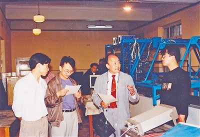 上世纪90年代初,杨士莪(右二)在实验室指导学生。 |