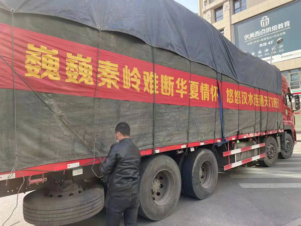 这批爱心蔬菜来自湖北天门,大卡车上挂的横幅“巍巍秦岭难断华夏情怀 悠悠汉水连通天门西安”表达着湖北人民的深情厚谊。(何延军)