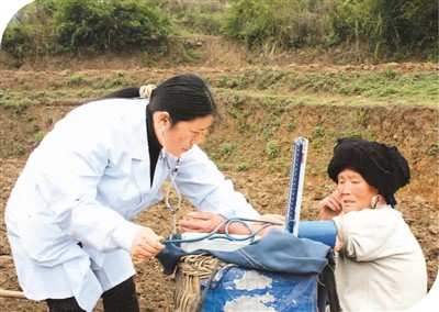 贵州省安龙县普坪镇戈塘村杨忠美老人患有高血压。一次巡诊时,潘凤去杨忠美家扑了个空,却在田间地头偶遇老人。图为潘凤为杨忠美老人测量血压。 |