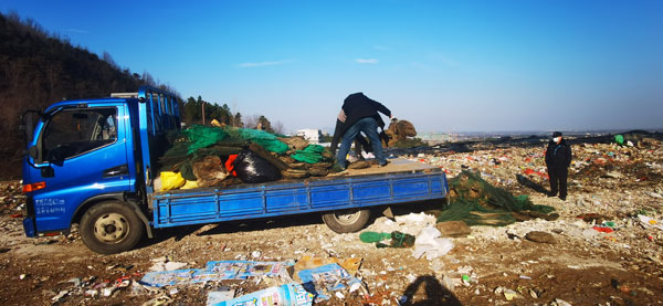 销毁现场,执法人员手持剪刀对地笼和丝网进行剪碎绞毁,统一运至溧阳市环境卫生管理处生活垃圾填埋场统一进行了无害化处理。通过现场展示、集中销毁的方式,营造了强大的执法声势,震慑心存侥幸的不法人员,坚决遏制住非法捕捞和非法销售行为,切实保护该市渔业资源和生态环境。