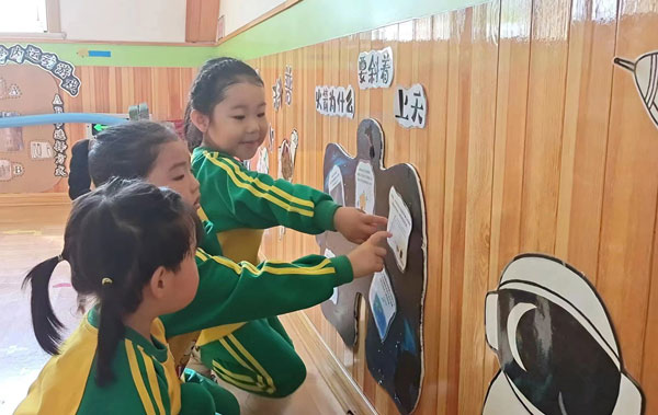 在“航天知识我知道”活动中,各班老师通过讲述航天英雄故事、播放神舟十三号发射视频等方式让小朋友们了解中国航天事业的发展历程与航天事业取得的伟大成就。此外,孩子们还走进“我是小小宇航员”主题廊道,了解航天的相关知识,在孩子们小小的世界里注入了满满的航天热情。