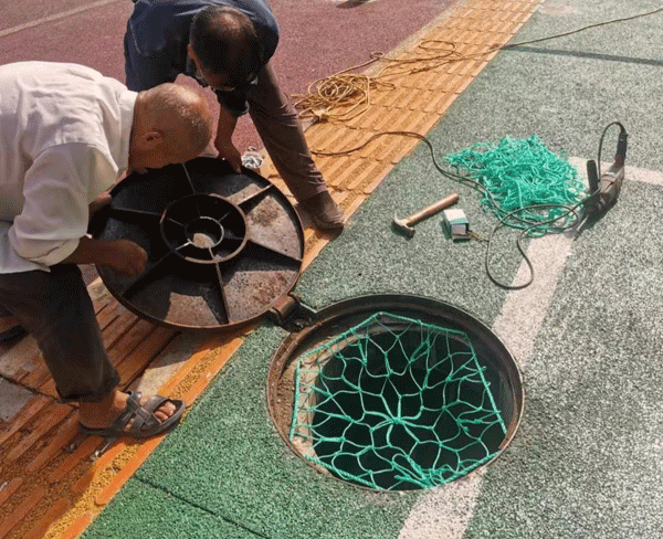 在施工现场,安装工人针对这一路段的窨井进行仔细研究计算。在井口打钻6个小孔、安装膨胀螺丝和挂钩、然后挂网固定。每完成一个防坠网的安装,工作人员都会亲自试踩检验,确保安装牢固。此次安装的防坠网不易脱落,可称重350公斤,能有效预防人员特别是孩童的不慎坠入,确保安全。