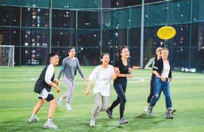 在重庆市江北区溉澜溪体育公园内,市民参与飞盘运动,锻炼身体。 |