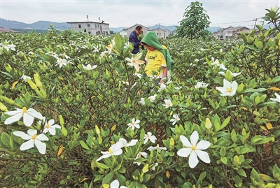 夏日,在江西省金溪县合市镇楼下村,黄栀子种植基地迎来栀子花开,吸引周边游客前来闻香赏花。
