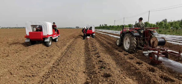 烟农先用挖穴移栽一体机进行移栽,再用覆膜机进行覆膜