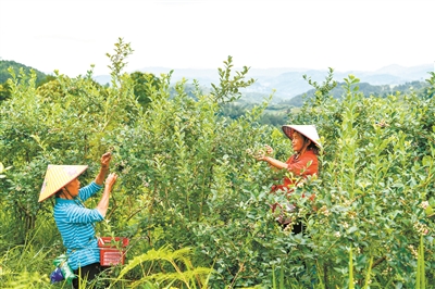 图:6月18日村民在贵州省麻江县蓝梦谷生态蓝莓园采摘蓝莓。