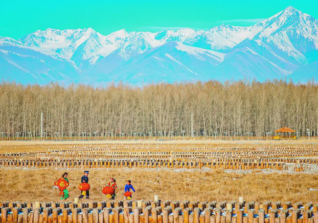 蔚蓝的天空、洁白的雪山、金黄的田野,层次分明又和谐相融,已是一幅曼妙的山乡冬景,又因几点赤红,增添了些明艳热烈。细瞧,身穿制服的民警步伐轻快,穿着民族服饰的孩子们回头张望,大家手握灯笼、福字,向村落走去。乡村之美不仅在景,更在人。共迎新春,美美与共,才是美丽乡村的魅力所在。