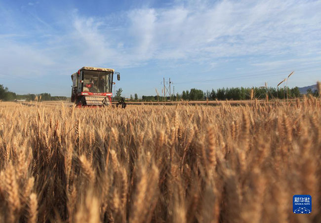 6月1日,在山东省临沂市平邑县卞桥镇新桥村,农机手驾驶收割机在田间收割小麦。