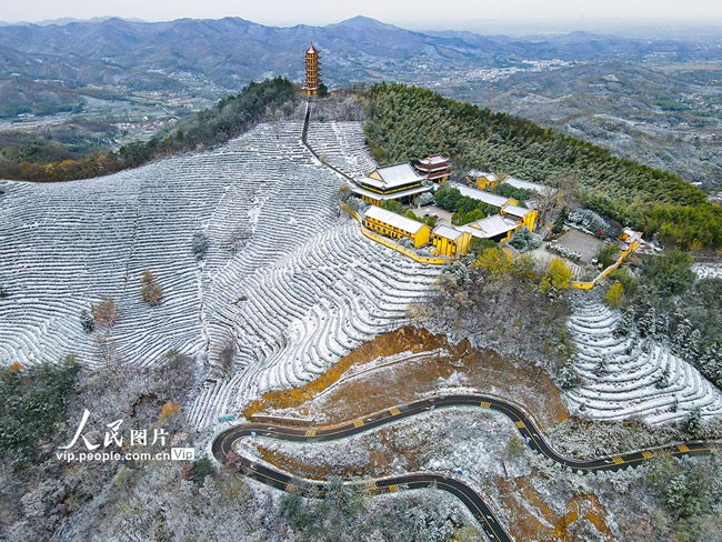 2022年11月30日,安徽省合肥市庐江县汤池镇迎来降雪,二姑尖盘山公路在雪中蜿蜒。李红兵摄(人民图片网)