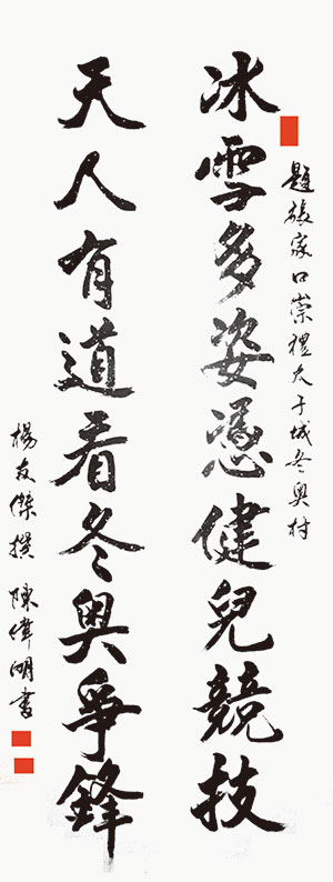 创作心得:本届冬奥会恰好在中国传统节日春节期间举办,正是送走牛年,迎来虎岁之际。创作此联时,首先想到了牛、虎这两个生肖。全联既融入了春节元素又切合冬奥会举办时间,以冰天、雪地切景,以牛气、虎威赞美各国健儿在冰天雪地中竞技争雄的壮观场景,同时对运动员圆梦赛场寄予了深深的祝福。