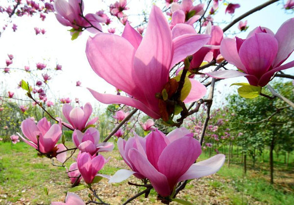 在浅山原野一块块田畦里一株株玉兰苗木你不让我,我不让你,都开满了花赶趟儿,姹紫嫣红,争俏闹春,硕大的玉兰花红的像火,粉的像霞,白的似雪,五彩缤纷,蔚为壮观,宛如一幅幅美丽画卷。