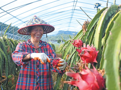 浙江省仙居县按照“农业园区化、产业规模化、农旅一体化”的发展思路,大力发展火龙果、无花果种植等特色产业,拓宽农民增收渠道。图为仙居县白塔镇火龙果种植基地里,农民在收获红心火龙果。 王华斌摄(人民视觉) |